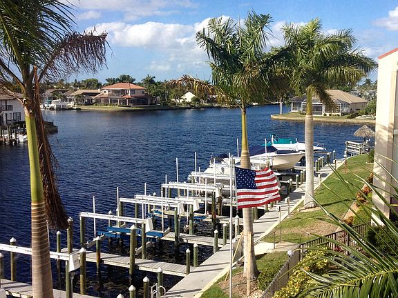 Penthouse and end unit which faces the pool as well as the docks, (which a dock was owned for this unit), that leads out via a short waterway, to the Caloosahatchee River which under the nearby Cape Coral bridge, opens up to the Gulf of Mexico. This unit has been immaculately kept/maintained and coveted by many of the other owners as the prime unit there. It also has a front patio which is great for star gazing and a covered back patio which over looks the canals. The side windows and kitchen/dining area over look the pool and the family room overlooks the canal and pool.