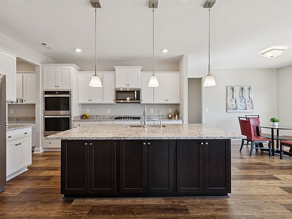 Welcome home to this beautiful all-brick, single-level residence in the heart of Spring Hill! The inviting covered front porch opens into a bright, open-concept floor plan ideal for both everyday living and entertaining. The spacious kitchen is the centerpiece of the home, featuring granite countertops, stainless steel appliances, a gas cooktop, double ovens, and an oversized island that provides ample prep and seating space. White cabinetry, pendant lighting, and warm wood flooring add to the home’s modern yet inviting aesthetic. The kitchen flows seamlessly into the dining area and living room, creating the perfect layout for entertaining or simply relaxing at home.