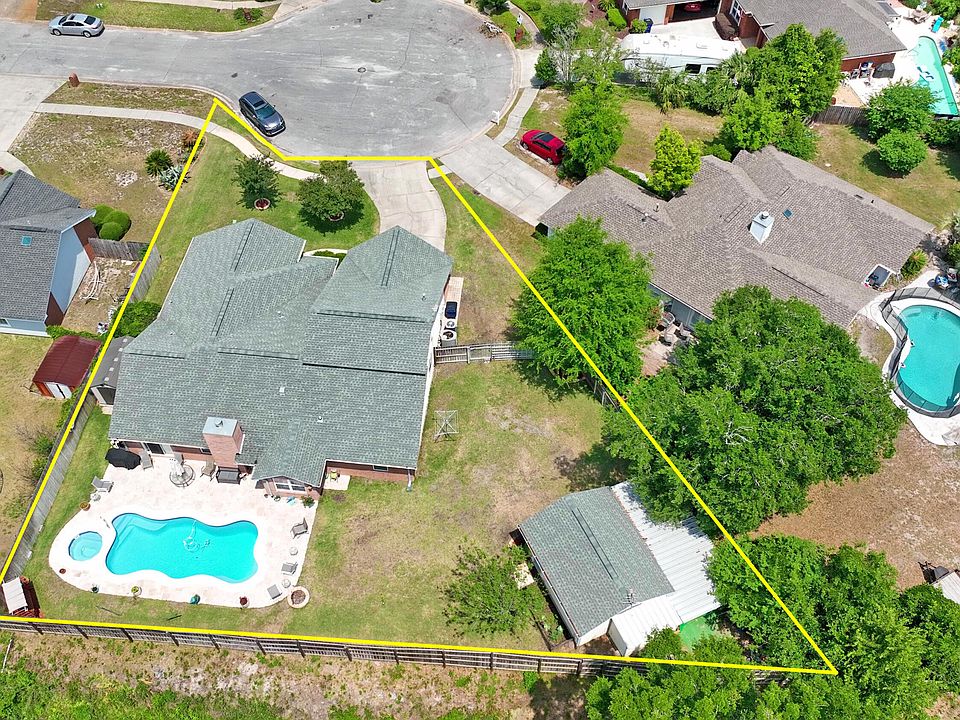 The backyard is a private retreat with a sparkling inground pool, paver deck, and full privacy fencing. Additional features include an attached 2-car garage, plus a detached garage and workshop with lean-to—ideal for storage, hobbies, or additional vehicles. A double gate provides easy access for a truck, trailer, or boat. The home also offers approximately 340 square feet of climate-controlled attic storage not included in the heated and cooled square footage, along with 120 square feet of covered porch space perfect for relaxing mornings or evenings.