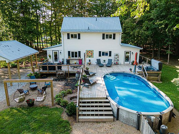 Inside, the home has seen extensive updates. The stunning kitchen, fully remodeled in 2023, boasts a custom-designed island with a black walnut live edge wood countertop, hammered copper sink, soft-close cabinetry, stainless steel appliances, and a wine fridge. Original hardwood floors flow throughout the main level, which also includes a dedicated office. The 1st floor primary suite has been expanded with a brand new addition featuring a luxurious spa-like bath with a no-lip walk in wet shower, soaking tub, new vanity, etc. A convenient first-floor laundry and half bath has also been added, along with a brand new wood-burner to keep the home cozy! Upstairs you'll find an open loft area and 2 additional bedrooms connected by a Jack-and-Jill bath. The partially finished lower level offers a family room w/ closet, an additional laundry area, and newly insulated crawl space. The home is well maintained with a water softener & filtration system, new well pump in 2024, regularly serviced furnace, sump pump w/ battery back up, and many updated fixtures & paint throughout. Outside is where this property truly shines!! Step outside to enjoy a brand new 14x53 back deck overlooking an inground pool and 6-person hot tub--perfect for entertaining or relaxing in your backyard oasis!! A brand new 48x53 pole barn with 100-amp service, multiple water lines, and 2 oversize garage doors provides incredible versatility. The barn also includes a horse stall with direct access to fenced pastures. The pasture is equipped with electric fencing, brand new run-in, new underground Ritchie automatic heated water system tied to the well. This is a perfect mini-farm or private country getaway!! Don't miss it!