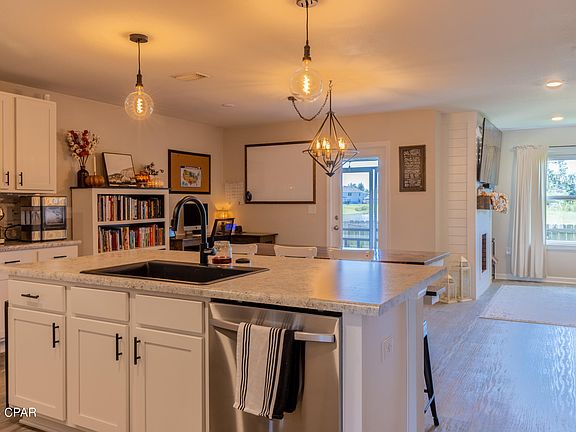 'CURRENTLY UNDER CONTRACT, SELLER WILL CONSIDER BACKUP OFFERS' Welcome to your dream home in Brighton Oaks! This beautifully maintained 4-year-old Craftsman-style gem seamlessly blends modern convenience with cozy charm. Boasting 1,714 square feet of thoughtfully designed space, this 4-bedroom, 2-bath residence offers everything you need for comfortable living. Step inside to find stylish vinyl plank hardwood-look flooring throughout, providing both durability and elegance. The kitchen is a true centerpiece, featuring wood cabinetry, a charming farmhouse sink, stainless steel appliances, and upgraded lighting—perfect for both cooking and entertaining. The open living area is anchored by a custom-built, code-compliant electric fireplace, setting the ideal ambiance for gatherings or cozy nights in. This home excels in functionality with smart storage solutions, including custom cabinets in the laundry room, added shelving in the pantry, and extra storage in the master bedroom. Every bedroom is outfitted with ceiling fans, ensuring year-round comfort. The home also comes equipped with a Ring Alarm system with video capabilities and smart switches, giving you modern security and convenience at your fingertips. Step outside to your private oasis: an enclosed, screened patio that invites you to relax while taking in serene water views. The meticulously landscaped backyard features an inground sprinkler system, fruit trees, a beautiful flower garden, and is fully enclosed with a wooden privacy fence—a perfect space for children to play. The home also includes an EV charging outlet, making it ready for your electric vehicle. Located on a quiet cul-de-sac, Brighton Oaks offers a wonderful sense of community and amenities such as a dog park for your furry friends. This peaceful neighborhood is conveniently close to shopping, dining, entertainment, and just 30 minutes from the pristine beaches of Panama City. It also provides easy access to Tyndall AFB, making it an ideal location for military families. Come see why this home offers the perfect blend of lifestyle, convenience, and beauty—you won't want to miss it!