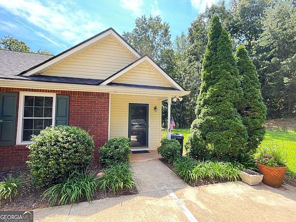 Fabulous End Unit Condo in Hidden Hollow. True to its name, this one is one of the most private, serene and wooded communities in North Hall. Enjoy the private back yard from the spacious patio with its well manicured and beautiful landscaping. Covered front porch opens into a nice foyer, open concept great room, dining and kitchen. Split bedroom floor plan with each having access to private bath. Primary bedroom suite faces the rear, huge walk in closet and walk in shower. Front bedroom is huge, private access to full bath, walk in closet and additional double wide closet. Kitchen with granite countertops tile floors and laundry room equipped with cabinets and shelving. This home has tons of storage with four closets, pull down attic stairs leading to floored space for even more storage, and back patio has a garden shed. Another nice bonus is the unit has three assigned parking places and mail box is on the property. HOA covers water, septic, exterior landscaping and structure maintenance, including driveway, roof, gutters, exterior doors and windows, patios and porches and exterior insurance for the home.
