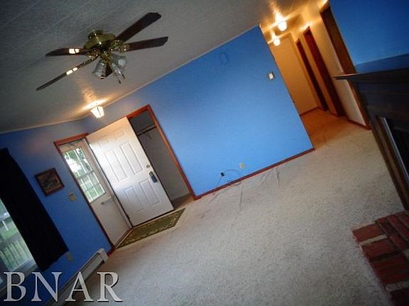 1.19 acres private, fabulous view on all 4 sides. 3 bed/2 bath, 1400 square foot ranch with full basement and attached 2 car garage. Extra 30x36 heated, insulated garage with a mechanic's pit to work underneath cars. Tree lines on all sides go with home. Private well. 1/3 mile from Howard Virgin timber. 2nd owner. $154,900. Property is being sold as is.