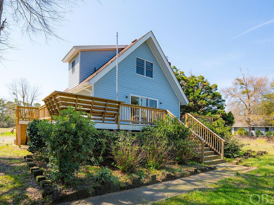 Welcome to your charming 3-bedroom home in the serene town of Kitty Hawk, where relaxation and tranquility are at your fingertips. This delightful home boasts a nearly one-acre lot with breathtaking marsh views, offering a serene backdrop for your daily activities. As you step inside, you will be greeted by the cozy living room, complete with an oversized slider that lets in plenty of natural light and provides stunning views of the surrounding nature. The open floor plan seamlessly connects the living room to the kitchen and dining area. There is one bedroom and a full bathroom on the first floor. As you make your way upstairs, you will find the other two bedrooms, one of which has an attached bathroom. On the ground level, there is a fully enclosed garage and workshop that has endless possibilities for however you want to outfit the space. Outside, you will find a large wraparound deck that is perfect for enjoying your morning coffee while taking in the breathtaking natural surroundings. The expansive yard provides ample space for gardening, outdoor activities, or simply enjoying the peace that Kitty Hawk Woods has to offer. Located just a short distance from the beach and local attractions. Do not miss this unique opportunity to experience the best of coastal living in Kitty Hawk.