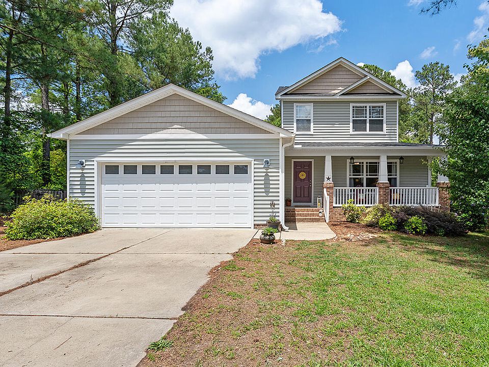 Charming two-story home in the desirable Bedford Forest neighborhood! Open floorplan & lots of natural light. Luxury vinyl plank floors thru main level including primary suite. Living room with gas log fireplace opens to kitchen with stainless steel appliances, breakfast bar & dining room. Spacious 1st-floor primary suite has walk-in closet & private bathroom w/double vanity. Upstairs features 2 bedrooms with carpet & ceiling fans as well as loft bonus area. Screened porch with beadboard ceiling and rocking chair front porch. Large flat fully fenced-in yard w/paver patio, fire pit & wired shed. 2 car garage. Convenient to shopping & dining.