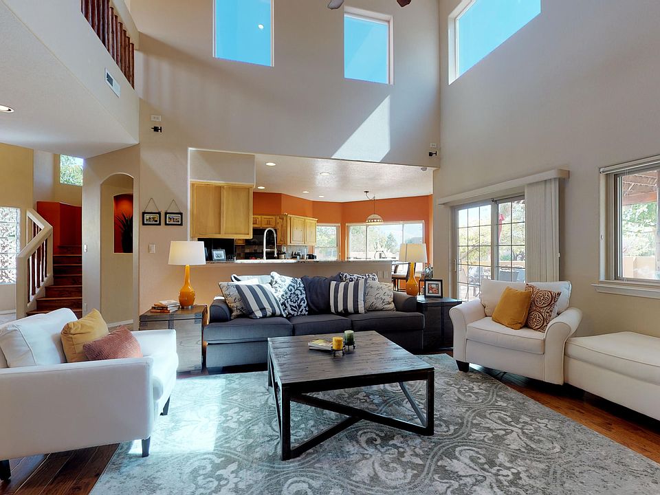 SELLER TAKING BACKUP OFFERS Stunning home in heart of Seven Bar North. Remodeled kitchen and baths w/ granite countertops & stone backsplash. Matching granite and stone around the fireplace. Recently painted interior accent walls and entire exterior, including roof seals, with elastomeric coating. Full length covered patio with trellis/pergola extension and flagstone seating area. 3 car garage Master bath with a jetted tub accented with double-side gas fireplace. From the upstairs deck you have amazing, panoramic views from the Sandias to downtown and beyond. Other unique features of the home include beamed ceilings, the spindles in the upstairs hallway wall as well as the upstairs deck, the railing along the stairs and the flooring in the great room are all wood. Clerestory windows.