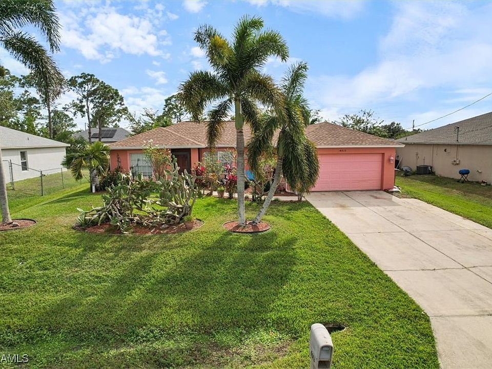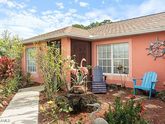 Charming 3-Bedroom home with Backyard Oasis in Southwest Florida! Discover your slice of paradise with this beautifully designed 3-bedroom, 2-bath home that offers comfort, character, and an exceptional outdoor retreat. The kitchen has a functional layout with a large pantry, breakfast bar, and a central island, perfect for preparing meals and entertaining guests. Tile throughout with Spanish tile in living areas that adds warmth and style! Spacious 2-car garage with plenty of room for vehicles and additional shelving for storage. Step outside the sliding doors to your own fenced in tropical paradise! The covered screened in lanai offers room for relaxing or entertaining all year long. Stone steps lead down to the backyards charming gazebo surrounded by lush landscaping that creates a peaceful haven. The mature palms and Hong Kong Orchard are something to be admired! With easy access to SW FL International Airport, beaches, schools, shopping, and dining this home has it all. New roof with upgraded shingles were installed in 2023.