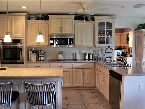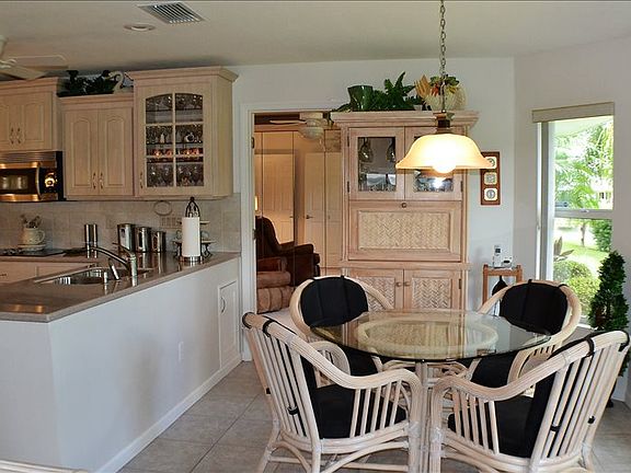 This tasteful home is better than new with a courtyard entry and lovely water & golf course views from every room in the rear of this home. Features include split plan, neutral colors, upgraded lighting and plantation shutters. The front arched dining room has a bay window. The large living room opens into the well appointed kitchen complete w/ upgraded stainless steel appliances with built-in microwave, glass cooktop and a charming dining area overlooking the pond. The third bedroom includes a murphy bed: making this multi-purpose room ideal for office or bedroom. The large master suite/bath includes walk-in closet, large corner vanity with double sinks, enclosed water closet plus a large wrap around marble shower w/glass block window. The laundry room and side-entry garage come complete w/ many built-in cabinets. All this on a beautifully landscaped lot. Furniture available.