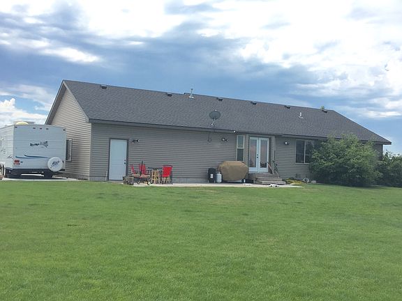 Beautiful home on one acre lot with large garden space, that could also be a location to build a shop. Solid Hickory cabinets in Kitchen, bathrooms, and laundry room. Solid wood flooring in most of upstairs installed one year ago, with new carpet installed in upstairs bedrooms and all of the basement 3 months ago. Entire house repainted at that time. Bathrooms and laundry room have tile flooring. Landscaped yard with trees planted for future windbreak, sprinkler system, patio out the back door and large stamped concrete fire pit/ picnic area. All concrete driveway with concrete RV Pad. Nice quiet neighborhood with no HOA fees. Basement fully finished. Jetted tub in the master bath. Gas fireplace in basement. Alarm system throughout the house stays as well as all appliances, including washer and dryer. All appliances are only 2 years old. 2 car garage.