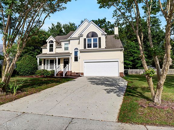 Welcome to 4013 E Durant Court, a beautiful 4-bedroom, 2.5-bath home nestled in the charming Carriage Hills neighborhood. This stunning property sits on a spacious third of an acre cul-de-sac lot surrounded by mature landscaping. Step across the rocking chair front porch and a two-story foyer welcomes you inside. Notice the hardwood floors and an abundance of windows which fill the home with natural light. The spacious kitchen includes stainless steel appliances, granite countertops, and a breakfast nook. To the left is a formal dining room, and to the right is a den or second living room which features custom built-in shelves, a bar, and a fireplace—an excellent space for entertaining! Step out onto the expansive back decks to enjoy the private and fully fenced in backyard. Upstairs you will find the primary bedroom suite which boasts vaulted ceilings, a walk-in closet, and an en suite bath with a garden tub and separate shower. There are three additional bedrooms on the second floor and another full bathroom. The crawl space has been encapsulated, ensuring a dry and healthy home environment. Carriage Hills offers a variety of community amenities including a clubhouse, pool, tennis courts, and playgrounds, all with low HOA dues. Combining modern amenities with classic charm, 4013 E Durant Court is an ideal home in a highly desirable location, close to beaches, dining, shopping, and much more. Don't miss the opportunity to make it yours!