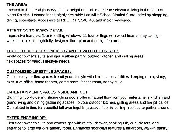 LIVE YOUR LUXURY. Executive modern farmhouse, thoughtfully designed for the elevated lifestyle. Entertainment spaces inside and out. Grande living and gathering areas. Private outdoor spaces feature outdoor kitchen and grilling areas, fire pit patio, and spacious, flat grassy lot for guests, pets and play. FIRST-FLOOR OWNERS SUITE, SPA AND LAUNDRY. Customize your flex spaces to suit your lifestyle: home theater, executive office, fitness room, nanny suite, keeping room. ATTENTION TO EVERY DETAIL: impressionable design features, 11 foot ceilings, floor-to-ceiling windows. Surrounded by shopping, dining, amenities, essentials, accessibility to RDU, RTP, 540, 40, Brier Creek, Midtown, Downtown Raleigh. LEESVILLE SCHOOLS! Home is in drywall stage. See virtual tour for 3D renderings (REPRESENTATIVE ONLY- design selections may vary). We are pleased to offer exclusive showings with 3D renderings, blueprints, and design selections for each room as we tour to bring this home to life. Design and blueprint portfolios are available upon request.