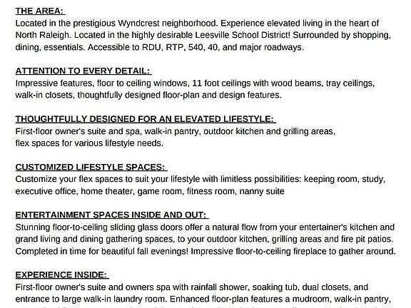 LIVE YOUR LUXURY. Executive modern farmhouse, thoughtfully designed for the elevated lifestyle. Entertainment spaces inside and out. Grande living and gathering areas. Private outdoor spaces feature outdoor kitchen and grilling areas, fire pit patio, and spacious, flat grassy lot for guests, pets and play. FIRST-FLOOR OWNERS SUITE, SPA AND LAUNDRY. Customize your flex spaces to suit your lifestyle: home theater, executive office, fitness room, nanny suite, keeping room. ATTENTION TO EVERY DETAIL: impressionable design features, 11 foot ceilings, floor-to-ceiling windows. Surrounded by shopping, dining, amenities, essentials, accessibility to RDU, RTP, 540, 40, Brier Creek, Midtown, Downtown Raleigh. LEESVILLE SCHOOLS! Home is in drywall stage. See virtual tour for 3D renderings (REPRESENTATIVE ONLY- design selections may vary). We are pleased to offer exclusive showings with 3D renderings, blueprints, and design selections for each room as we tour to bring this home to life. Design and blueprint portfolios are available upon request. 2022-08-26