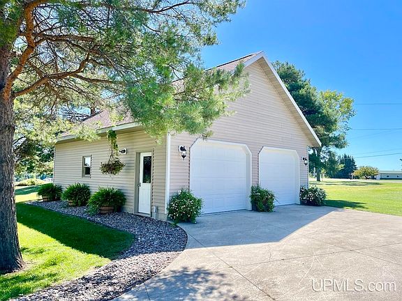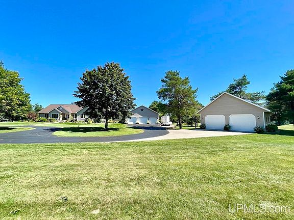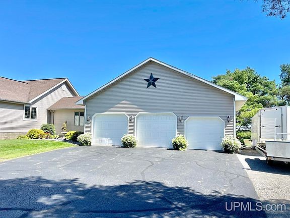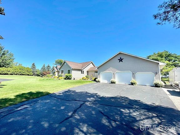 Beautifully updated executive home in Bark River. Coming down the blacktop driveway you will see the well landscaped yard, 3 car attached garage and a 2nd 2+ car detached garage. Walking in the front doors is a nice open entryway. There is a large living room that features a gas fireplace, high tongue & grove ceilings and patio doors out to the back deck. Off the living room is the primary bedroom suite! Spacious bedroom with 2 walk-in closets, full bathroom with soaker tub, double sinks, walk-in tile shower & it connects to the bonus room/home office. The den could also make a great formal dining room. Bright renovated kitchen displays white granite countertops, center eat-in island, newer appliances and a dining area. Down the hall is a convenient half bathroom. The 2nd & 3rd bedrooms have a shared private full bathroom and walk-in closets. Finished breezeway has main floor laundry & a space heater. Heading downstairs, you will find an entertainment area with wet bar that has also been updated with granite countertops. 2 bedrooms and a 3/4 bathroom. There is also plenty of storage space and lower level laundry facilities. The newly updated large 2 tier trex decking is the perfect spot to relax and soak in the country scenery.