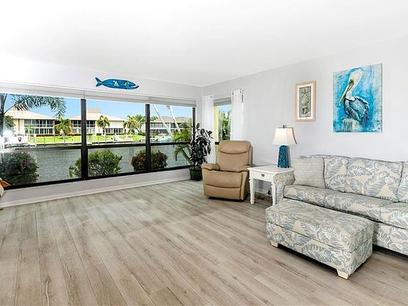 Did Not Last! New Listing, FIRST FLOOR END UNIT, 55+ Complex on 200+/- Gulf Access Canal. Just a few minutes to the River. You can tie your boat (up to 30 feet) right in front of this unit. Condo has been recently remodeled throughout!. Offers a inviting Beach Decor with grey tile and laminate flooring and white cabinetry. Hurricane Impact windows have been installed and an electric Kevlar roll down in the lanai. Just walk out the screen lanai to the Captain's walk and sit on the bench to watch the Sunset. Well maintained complex offers lovely tropical landscaping. There is an oversized deep garage across from the front door with coverage from the elements. AC has been upgraded and so much more. Will not last!