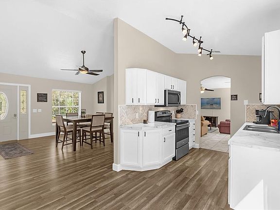 Move-in Ready! Upgrades & Updates Throughout! Welcome to this beautifully remodeled POOL home in the quiet and established neighborhood of Carlton Village—just minutes from downtown Lady Lake. Perfectly designed for both family living and entertaining, this single-story home features an in-ground pool with a fully enclosed screened lanai and extended patio, creating your very own backyard oasis. Inside, the home showcases a remodeled kitchen with custom cabinetry, new counters, stainless steel appliances, and ample storage. Updates continue throughout with remodeled bathrooms, new doors, fresh neutral paint, designer lighting, and a combination of tile and luxury vinyl plank flooring for low-maintenance living. A set of new sliding glass doors offers stunning views of the pool and backyard. The converted garage provides a large, versatile bonus space—ideal as a bedroom, family room, game room, or private retreat. Additional highlights include a new roof (2022), ceiling fans, a transferable home warranty, and a fully fenced yard with beautiful landscaping. No HOA means added freedom, while the nearby park with lake and nature trail adds to the charm of the location. This home offers the perfect blend of country living and cozy comfort, with easy access to HWY-441, local shops, and dining. Truly move-in ready, this pool home checks every box—don’t miss your chance to make it yours!