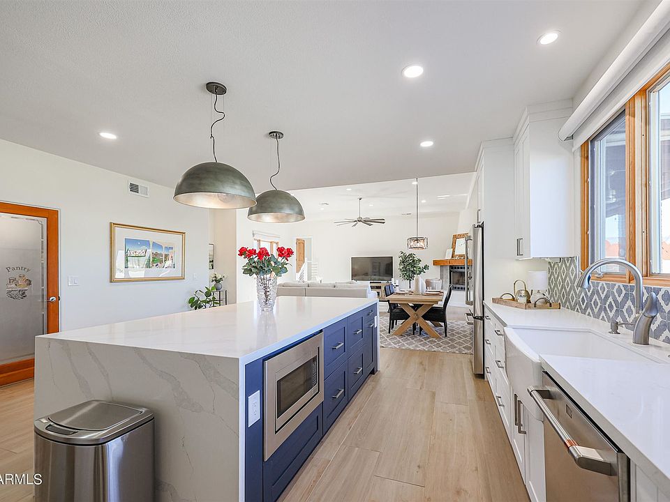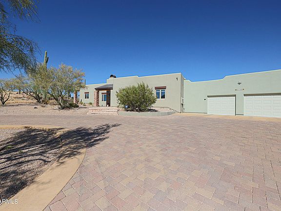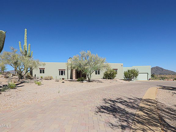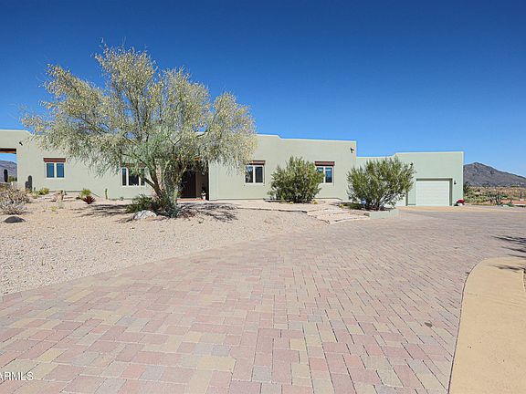 Custom designed luxury home surrounded by panoramic mountain views & amazing sunsets! Open-Concept floorplan is great for entertaining! Kitchen offers ample cabinetry w/SS appliances, walk-in pantry, XL kitchen island w/breakfast bar & waterfall edges; opens to great room featuring 12-ft ceilings, upgraded tile floors & corner fireplace. Split primary suite w/private patio, spa-like bath w/luxe shower, soaking tub, dual vanities & designer closet w/multiple storage options. Two large secondary bedrooms offer a quiet & relaxing space to unwind. Step outside into your resort-style backyard equipped w/diving pool, waterslide, above-ground jacuzzi, sitting area & outdoor fireplace. Property sits on 2.4 acres & includes horse privileges. Come & See how easy it is to fall in love w/this home!