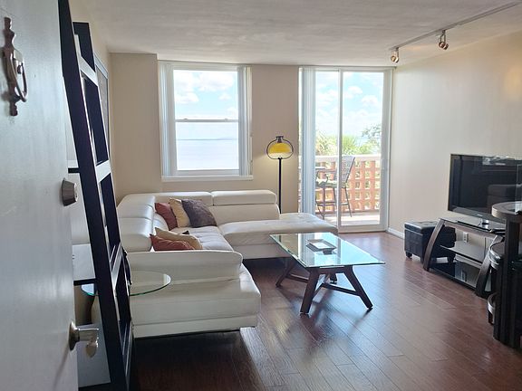 Waterfront condoPrivate balconyOpen floor planVinyl wood floorStainless-steel appliancesKitchen with wood cabinets