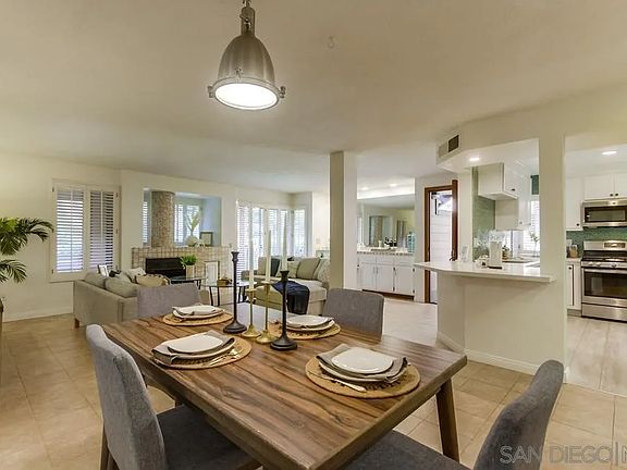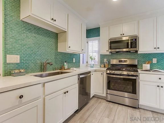Stunning turnkey town home just blocks from the Ocean! This immaculate 2 master bedroom/2.5 bath home is located West of the I5 in Old Carlsbad just a stone’s throw to the beach and THE happening Carlsbad village! Beautifully remodeled kitchen features gleaming white quartz counters, white shaker style cabinets, all stainless appliances, luxury vinyl plank flooring, a cozy breakfast nook leading to the adorable courtyard patio! A bonus feature is a fully remodeled half bath is downstairs as well! The open concept living areas lend to an entertainers life style, with an open bar seating area, an oversized wet bar with plenty of storage below, and great combination dining and family room area around the cozy fireplace. Additional outdoor patio area looks immediately over the beautiful tropical style peaceful lush common area. The second story boasts dual master suites. The master bathroom is completely remodeled featuring quartz counters, double vanity with white wood cabinetry, oversized shower with rain shower head & separate handheld shower wand, beautiful beach glass & subway tile design with bench and luxury vinyl flooring