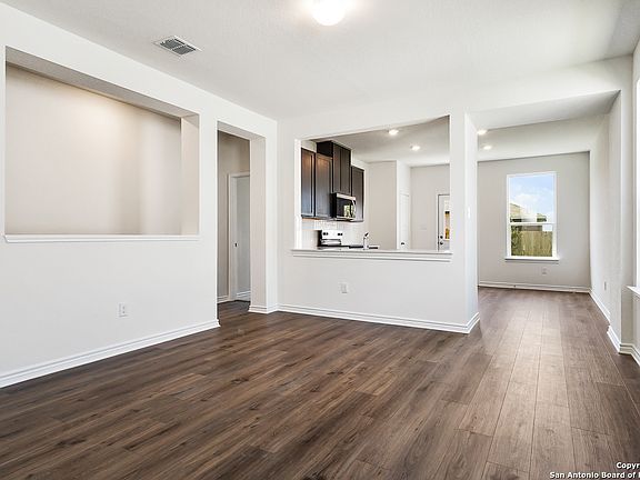 This inviting home boasts 9-ft. ceilings on the first floor, creating an open and airy atmosphere. A den with double doors offers a perfect private retreat. The kitchen features Whirlpool stainless steel appliances, Woodmont Dakota Shaker panel 42-in. upper cabinets, a Daltile tile backsplash, and Silestone Blanco Maple countertops. The primary bath includes upgraded cabinets and a 42-in. garden tub/shower with a Daltile tile surround. Elegant touches throughout include a Carrara style entry door, Kwikset Polo knob interior door hardware, and vinyl plank flooring in the bathrooms, great room, and kitchen. Additional features include a wireless security system, automatic sprinkler system, and a fully sodded yard.