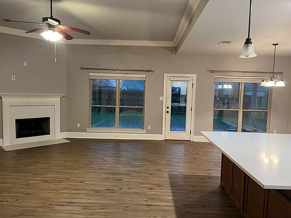 Very open floorpan with oversized newer center kitchen island featuring cabinets on front and back and quartz counters.(2023) as well as newly painted cabinets throughout (2023). Extra large pantry & good sized laundry. 9 and 10 ft ceilings. Newer LTV flooring in all but 2 bedrooms and baths. (2023). Wood burning fireplace with gas lighter features gas log to remain. Whole house water filter insures clean water. 6 ft privacy fence upgraded to enclose entire backyard on the oversized lot with no neighbors to the left or close in the rear. Best Flood Zone X. Front stucco all redone. (2025)