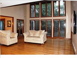 1991 Parade Home. Completely remodeled. Nestled in 2.5 wooded acres. Freshly painted exterior. Privacy fenced backyard with inground pool surrounded by exposed aggregate patio includes exterior speakers and private covered patio off of basement bedroom. Fantastic views from different tiered levels. Great Room with 22' ceilings, see through fireplace and ceiling to floor windows. Gourmet kitchen with all new stainless appliances, granite counter tops and wood floors opens to sunroom with wood burning fireplace which opens to outdoor deck. Main floor master bedroom with separate whirlpool tub, large ceramic tile shower, his and her closets and double vanities. Upstairs offers 2 bedrooms with Jack and Jill bath as well as a loft area for relaxing and reading a book. Full finished basement with heated tile floors, fireplace, 1 bedroom, 1 full bath, large laundry room with folding counter and laundry sink, and huge family room walks out to the pool area. House is wired for surround sound. Decks off of all bedrooms on upper levels. Exterior outlets with photo eyes for Christmas lights. All updated bathrooms. 2 linen closets. Spacious open floor plan. 2 central air units, upstairs is a new high efficiency 95%. 2 furnaces.Buyers agents welcome!Additional property info: http://www.forsalebyowner.com/listing/4-bed-Single-Family-home-for-sale-by-owner-4016-Orchard-Rd-47720/23970212?provider_id=28079