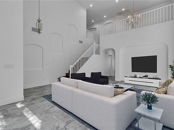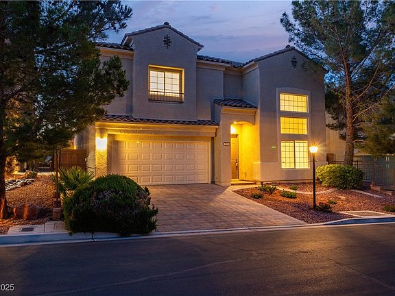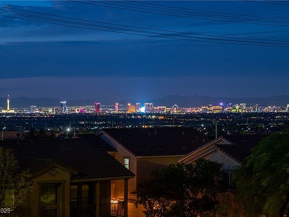 Gorgeous home featuring breathtaking mountain views in the front and stunning city and Las Vegas Strip views from the spacious, oversized primary suite with a retreat and balcony spanning the length of the home. This 3-bedroom + loft home includes a full bedroom and bath downstairs and is located in a serene, gated community near a lush park, with hiking and biking trails just outside your door. The house has an impressive entryway with a high-volume ceiling! Both the interior and exterior have been freshly painted. This beauty features custom kitchen cabinets, an island, quartz countertops, tile flooring throughout, a covered patio with a gas stub, a walk-in shower, and a spacious pantry. This home is not only beautiful inside but also offers fantastic outdoor views. Total $70K price adjustment. It's a must-see! You won't be disappointed.