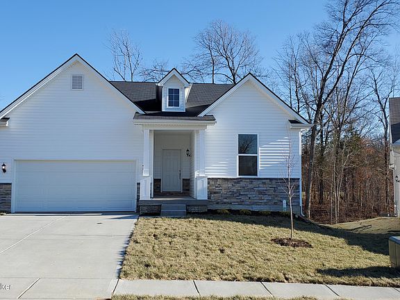 Charming and spacious ranch style home in one of Oldham County's most desirable new home locations! Close to parks, schools, & shops. This gorgeous 2 bedroom home boasts nearly 2,000 sq ft on the main level, as it sits over top a huge walkout basement with over 1800 sq ft of space. Basement is roughed in for future bathroom and has plenty of space to finish a large area and still have massive amounts of storage space! Garage is a 2 car with storage. Storage space is about the size of a car. The interior of the home has no expense spared, as it has granite countertops throughout, luxury vinyl plank flooring, built in appliances, gas fireplace, and fully tiled owner's shower with frameless glass doors, just to name a few! **Builder to convert flex room into 3rd bedroom in the next few weeks