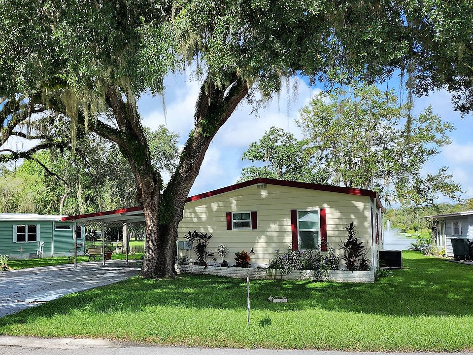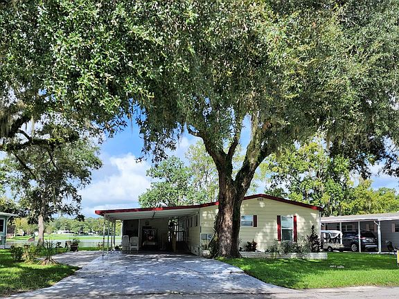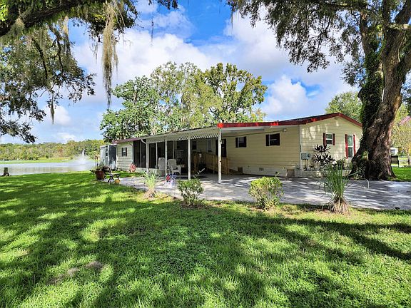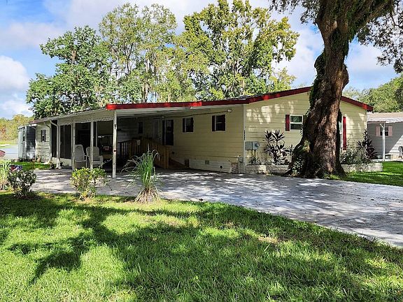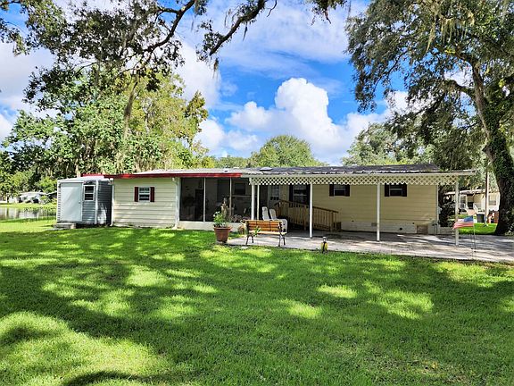 This lovely waterfront home is located in the age qualified community of Clover Leaf Farms. This home is move in ready and offered furnished. The first thing to impress is the large yard and plenty of parking.... but then the VIEW! So much room to enjoy with extra paver driveway, large open carport leading to laundry in attached shed. There is additional storage in newer 6x8n shed in back. There is also a nice wooden ramp at carport for assistance and a metal ramp in back - these can easily be removed if new owner doesn't need them. The kitchen offers newer stainless appliances, many windows in the home have been replaced w/double paned and the home has vinyl plank flooring and plywood subfloors throughout. A new vapor barrier was installed in 2020. Roof and HVAC approx. 8 years old. New sliding windows recently added to screen porch to upgrade to a very nice 4 season sunroom. This home needs nothing but a new owner. Monthly fees for waterfront are $743 and include water, sewer, trash and lawncare plus many awesome amenities.