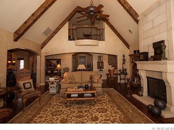 Exceptional former model. Unique plan w/formal office & dining, open kitchen,"hearth"room, vaulted family& 2 bedrooms down.Game &1 bed/bath up (staged as media). 3 private patios. 3-car side-entry garage w/workspace.Gated area w/pool & ponds. Jenks SE.