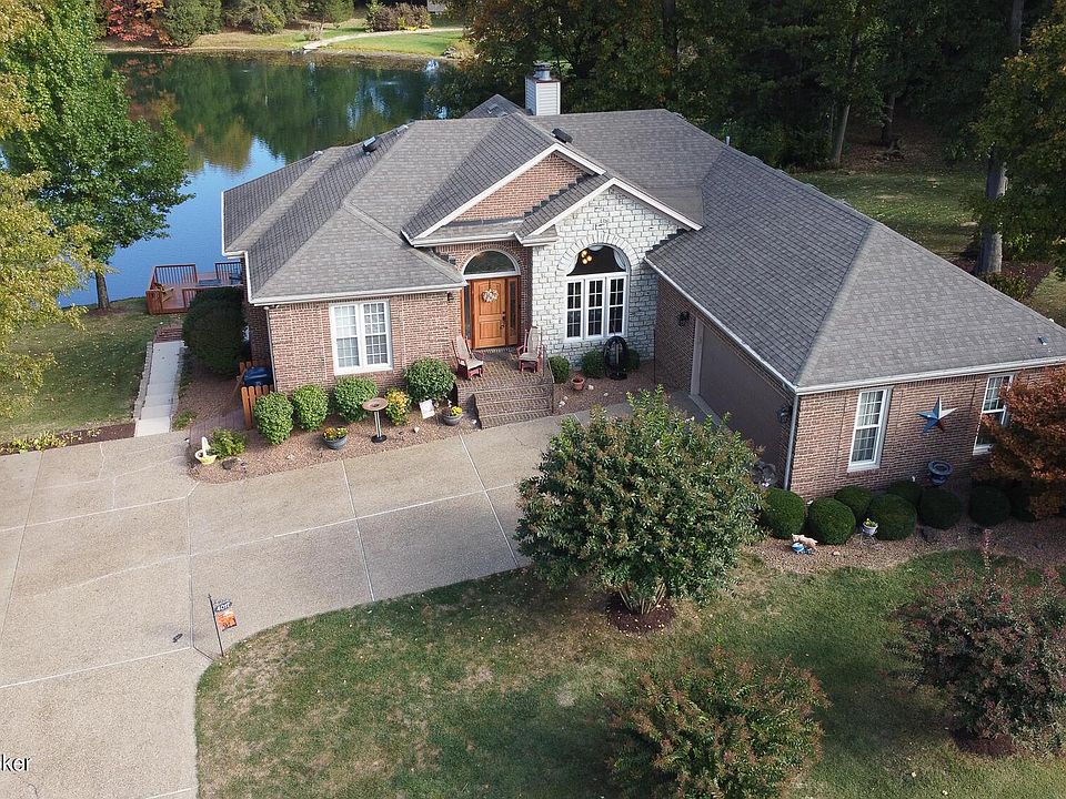 RARE Find In Oldham County, On a Lake, Walk-Out Ranch, 1.46 Acres, 3 Decks (including Dock), Sauna, Updates, Open, Fantastic Location In A Very Private setting In South Oldham School District and Close To shopping. This beautiful walk-out ranch offers a gorgeous view of the lake and is nestled in back of an upscale neighborhood. Walk into a formal entryway that opens into a large Great Room with glass doors overlooking the large lake. The Great Room features vaulted ceilings, gas fireplace, and is open to the large eat in kitchen which features stainless steel appliances, granite countertops and white cabinets along with a tiled ceramic backsplash also with wonderful views of the lake. The split floorplan offers privacy and you'll find a primary suite that also has its own private screened in covered deck, the primary bathroom offers a large walk in shower and be sure to see the two separate his and hers closet in the primary bathroom. There's also a private water closet and double bowl vanity sink with granite countertops. On the other side of the home you'll find two good sized bedrooms, one of them being used as an office, and full updated bath, also with Granite countertops. The lower level will excite you! You'll find a large family room with wet bar that leads to a new full kitchen. There are also glass doors that lead out to a private patio, again looking out to the view of the lake and backyard. In the storage room you'll find the Sauna and workbench. The property is a good size, with more than 1.4 acres of land and water. Note that part of the acreage does include the lake. There is an outbuilding on one corner of the property that will also stay with the house. The property sits on a cul-de-sac and is great for growing families or anyone looking to downsize and enjoy life! Come see this one today! Exquisite decor! One of a kind! Come see it today.