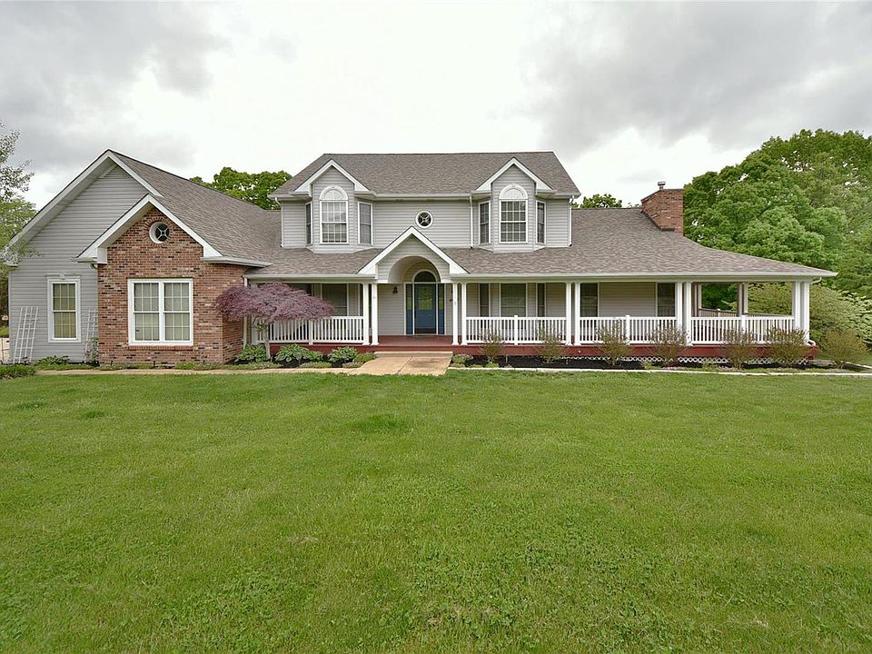 Looking for a spacious home on acreage? Take a look at this impressive 4 bed/4.5 bath 1.5 story home! A wrap-around porch welcomes you home & into the 2-story entry foyer with a dining & living rm to either side. The wide open floor plan features a central open staircase with balcony overlooking the massive great room with a towering cathedral ceiling, floor-to-ceiling brick fireplace & French doors that walk-out to the partly covered deck. The bright & inviting kitchen features 42in custom cabinetry, solid surface counters, butler pantry & breakfast bar connecting to the breakfast room with double french doors to the deck. Main floor master suite with tall cathedral ceiling, fireplace, 13x9 walk-in closet & luxurious private bath, double vanity, corner jet tub & walk-in shower. Upper level adds a large loft, 3 bedrooms & 2 full baths. The 5 ac partly wooded lot is breathtaking with it's waterfall & pond with built in filtration & salt water system. Currently used as a natural pool.