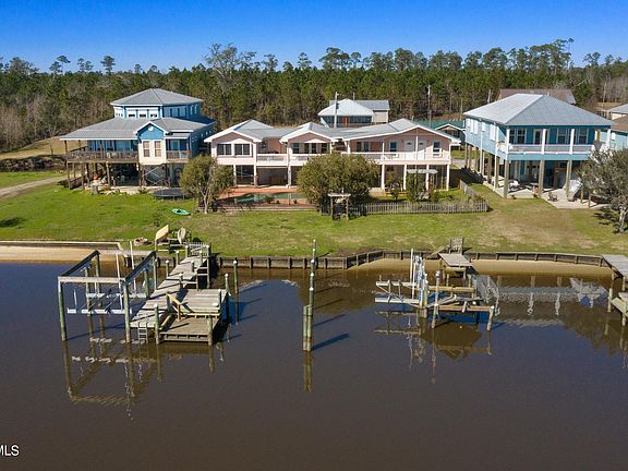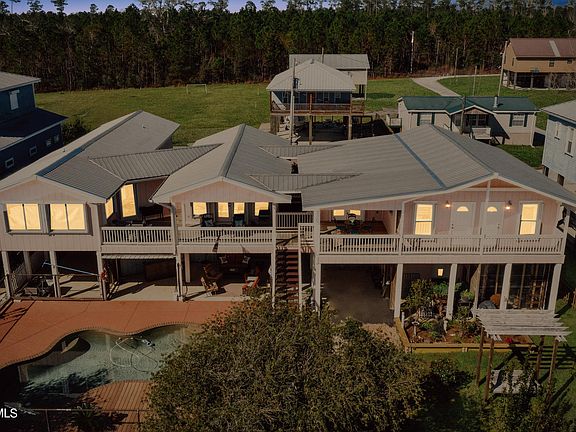 LOCATION LOCATION! Properties on the main Jourdan River are rare finds & this lovely home in a private neighborhood is special. Unique split floorplan is ideal for shared vacations or rental income. Gorgeous panoramic river views will reward you with fabulous sunrises & bald eagle, osprey & otter sightings. Custom features include vaulted wood ceilings, white bead board walls & bamboo floors. 4 bedrooms offer room for many guests, even a fun loft for little ones & a murphy bed in the den, two laundry rooms & bonus AC'd rooms & bath downstairs. Outside features include a boat lift, private shared boat launch, fenced saltwater pool, fenced yard for your pets, greenhouse area & hurricane shutters. Redfish & speckled trout can be caught from the pier! BEING SOLD FURNISHED, MOVE IN READY