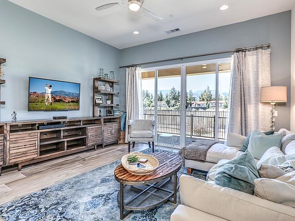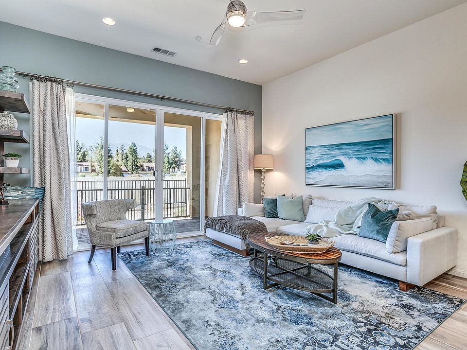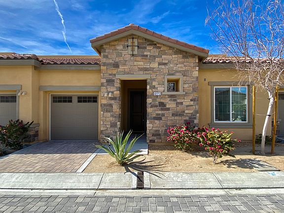 Welcome home to Villa Portofino, the Desert's premier 55 or better community located in the heart of Palm Desert. The epitome of desert elegance can be found in this turnkey furnished, 1610 square foot Ravello Aviano model featuring two bedrooms/two full bathrooms with large interior courtyard and attached garage. Built in 2016 and enjoyed on only a few occasions, this residence offers a desirable split floor plan and shows like a pristine model home featuring an abundance of upgrades skillfully selected by an interior designer. You will appreciate the wide porcelain wood-grain tile flooring, custom wall coverings throughout, quartz countertops, SS appliances, custom window coverings and light fixtures, built in workstation and more. Additional upgrades include a Nest thermostat, Ring doorbell, ceiling fans throughout and additional recessed lighting. This solar powered home has a low lease payment of $34 per month so you can live cool as a cucumber in the hot summer months guilt free. The interior courtyard has a propane fireplace and is great for entertaining or having an intimate dinner under the stars. Your HOA dues include access to the award winning 30,000 square foot clubhouse with movie theater, bistro, concierge, yoga studio, fitness center, lib