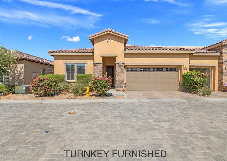Turnkey Furnished Ravello Collection Granada Model in Premier 55+ Community. This beautifully upgraded 3-bedroom, 2-bath home is located in the sought-after Villa Portofino community. Enjoy the privacy of a pavered front courtyard and a covered loggia--perfect for relaxing or entertaining. The open-concept floor plan features wood-look tile flooring, carpet in the bedrooms, and a stylish kitchen with white cabinetry, quartz countertops, a large island, stainless steel appliances, a designer backsplash, and recessed lighting. The spacious primary suite includes a generous walk-in closet and a large bathroom. Energy-efficient upgrades include a tankless water heater, EV charger, and solar panels. Enjoy resort-style living with access to the 30,000 sq ft clubhouse offering a private 100-seat movie theater, cafe and dining room, pool and spa with cantina, a state-of-the-art fitness center, social activities, and more. The low HOA dues include landscape maintenance and a cable package--offering unbeatable value.