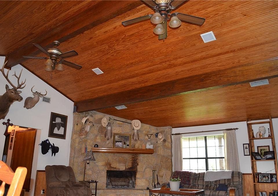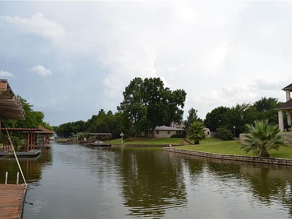 WOW factor living room with beautiful tongue and groove wood on vaulted ceiling, corner rock fireplace completes a rustic look in this large living area overlooking a lush backyard and water. Large master suite with extra large mstr bath. The large covered patio overlooks the water with a boat dock and boat lift. Sprinkler system from the lake for a well maintained yard! Large kitchen open to living-dining area with updates. Awesome location!