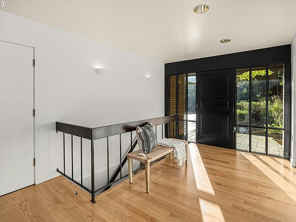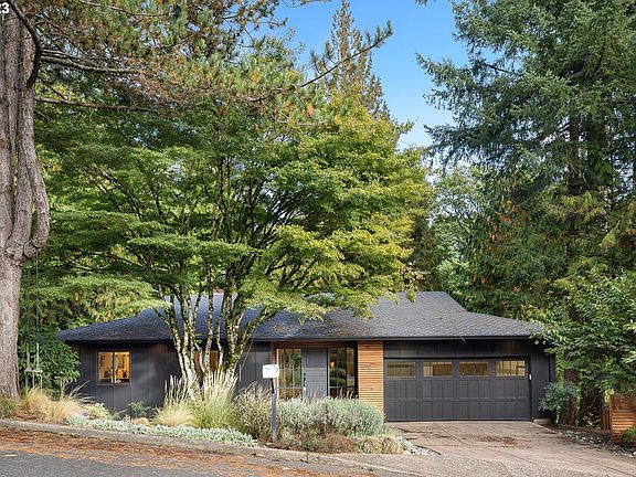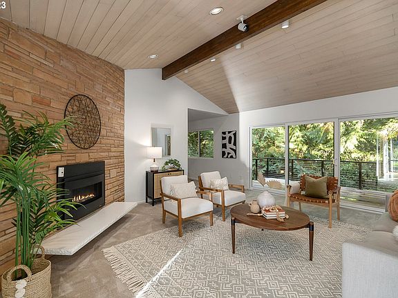 Stylishly fabulous Mid Century Bridlemile home on a private loop backing to a tranquil green space with a forest trail. This beautifully updated home is welcoming and spacious with exposed beams, large custom windows, expansive vaulted ceilings, and oversize glass sliders leading out to the new Brazilian hardwood decks which offer a perfect space for taking in the natural outdoor beauty. The 3 full baths and upstairs half bath have all been updated with gorgeous designer finishes. The chef's kitchen is a perfect blend of function and beauty and offers a breakfast bar and dining nook. The lower level features two bedrooms with luxe bathrooms and bonus spaces for a gym or an additional office / den. The lower patio features a private garden patio with a hot tub and fire pit. Enjoy a hike on the forest trail or walk up the path to the well-loved neighborhood pool. [Home Energy Score = 3. HES Report at https://rpt.greenbuildingregistry.com/hes/OR10204841]