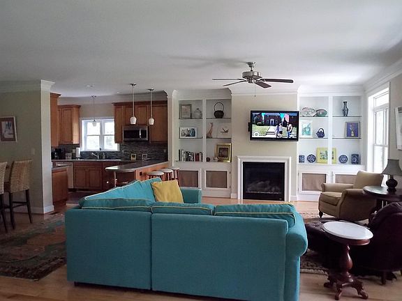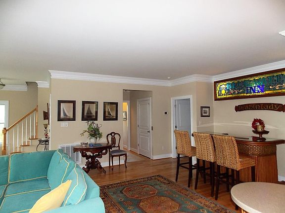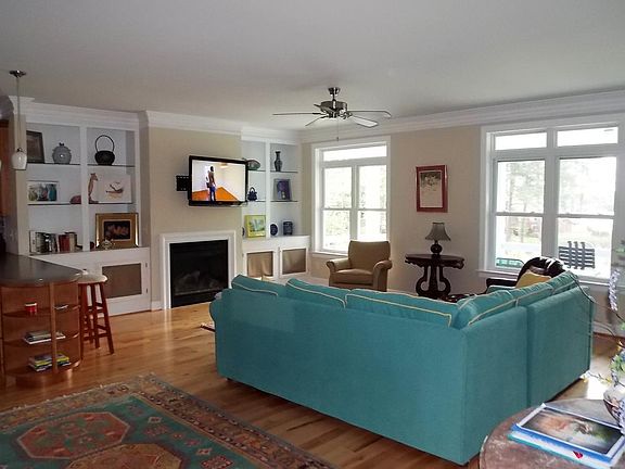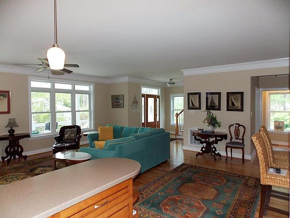 This three bedroom, 2.5 bath 2400+- square foot home has both views and a new private boat dock on Greens Creek. The home will accommodate eight overnight guests and is located moments from the village of Oriental. Open floor plan with large flat screen television in living area, working fireplace and dry bar. The Master Suite is located on the 1st floor and adjourns a generously-sized bathroom complete with shower and Jacuzzi tub. A small screened porch sits just off the Master Bedroom. Full stocked kitchen complete with stainless steel appliances?full sized refrigerator, stove/oven and dishwasher as well as coffeemaker, disposal, icemaker, microwave and any utensils needed to whip up a gourmet meal. The home has a private elevator that accesses each floor as well as the ground level. Second floor houses two bedrooms with a shared bath and a billiards room complete with pool table, large flat screen TV and a private sun deck. Linens are included as well as WIFI and satellite television. Guests enjoy a pass to Oriental's Health and Fitness Club for the duration of their stay. The Health and Fitness Club offers daily classes, an indoor pool, fitness and weight equipment, steam rooms. Dog Friendly Vacation Rental - Rents daily (2 min), weekly or monthly (rates change per IN (April 1st to Oct. 31st) and OUT OF Nov 1st to March 31st) season)