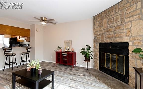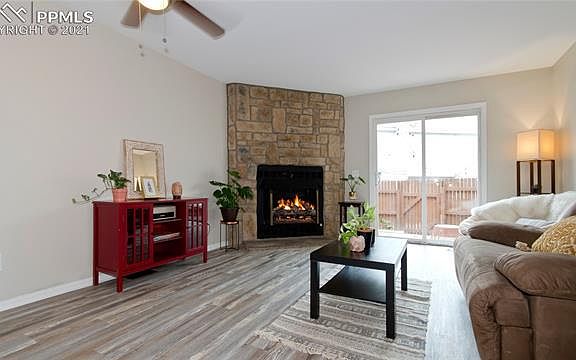 Welcome to this charming townhome in a well-maintained community close to lots of shopping and dining, The community is an easy drive of 15 minutes to Peterson AFB and Fort Carson, 8 minutes to the Colorado Springs Airport, and less than 15 minutes to our lively Downtown. The townhome's main level features an eat-in kitchen with new stainless steel appliances, fresh paint throughout, new luxury vinyl wood-like flooring in the living room, and ceramic tile flooring in the kitchen and entry hall. The living room comes with a welcoming stone fireplace and a walkout to the back deck. The 6-foot fenced-in deck is low maintenance and accesses a large common green space, perfect for walking your pup! There is a storage shed adjacent to the deck which is great for storing gardening supplies or even a bike. The upstairs has 2 large bedrooms, the master bedroom has an oversized closet with an adjoining bathroom and a large window that lets in wonderful natural light. The upstairs bath has been freshly updated with a new vanity, LifeProof vinyl flooring, trendy subway tile, and an efficient dual-flush toilet. The stairs and the upstairs hall have new carpeting and the bedrooms have the same flooring as the living room. The basement is fully finished to include a large living space with a storage closet, and a bathroom with a shower. The basement can be used as an office, guest room, or additional family room! Enjoy hassle-free homeownership at its finest with an HOA that includes exterior and common area insurance, pool, trash removal, water, sewer, snow removal, exterior maintenance, landscaping, and security.