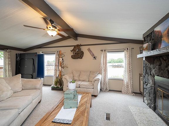 Nicely updated 3 bedroom, 2 bath manufactured home with an addition on a permanent foundation. The home features a large living room plus a den with a wood burning fireplace, office area, large closets in every room and is move in ready! Sits on 1.14 beautifully landscaped acres with chain link fence in addition to the nice wooden perimeter fencing. You will enjoy relaxing on the large deck with pergola. As an extra bonus, included in a very nice 30'X24' shop building with concrete floor, electric, an overhead door and a lean-to. Plus an additional storage building. Located close to town in a desired location.