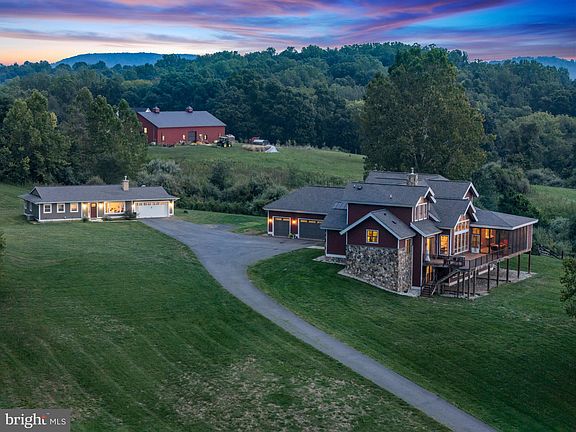 Welcome to Millcreek Meadows, a custom craftsman-style estate nestled on 20 bucolic acres in the heart of Lovettsville, Virginia. This exceptional property was meticulously designed by its owners, offering unique touches and quality craftsmanship throughout. The home features a stunning arched front door that opens into an inviting open floor plan, where vaulted ceilings and exposed timber beams accentuate the spacious family room. Here, a floor-to-ceiling stone fireplace with a gas insert serves as the room's focal point. The adjacent dining area comfortably seats twelve, perfect for gatherings large or small. The gourmet kitchen is a chef's delight, boasting a large island, custom quality cabinets, and top-of-the-line appliances, including a six-burner cooktop with griddle and a commercial vent hood. A pass-through window to the screened deck makes entertaining effortless. The main-level primary suite is a serene retreat with high ceilings, rich wood floors, and access to the rear deck. The luxurious en suite bathroom features custom double vanities and thoughtful design details. An additional main-level guest suite offers comfort and privacy, while the office and a well-appointed mudroom—complete with a dog shower—add convenience. Upstairs, you’ll find two additional bedrooms, each with en-suite bathrooms, and a large multi-purpose room that can adapt to your needs. The finished basement continues the theme of versatile living spaces, featuring an industrial vibe with concrete floors, a large bar and rec room, gym space, and a media room. Millcreek Meadows also includes a charming 2-bedroom guest cottage, perfect for in-laws, guests, or short-term rental opportunities. The guest cottage features a cozy living room with a gas fireplace, a kitchen with island seating, a primary bedroom suite, and a second bedroom with a hall bath. This property’s 20 acres provide ample space for gardens, livestock, or even a family compound, with approved subdivision for a 5-acre lot. The picturesque setting includes a pond with a duck house, adding to the charm of this rural retreat. Despite its peaceful location, Millcreek Meadows is just 15 minutes from shopping and major commuting routes, offering the perfect blend of serenity and convenience. Don't miss the opportunity to make Millcreek Meadows your dream home!
