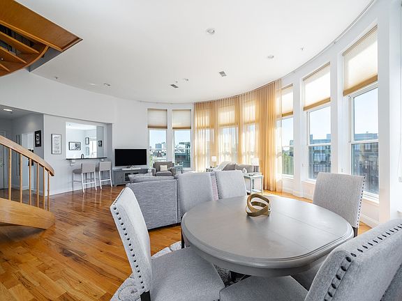 Towering high above is the prestigious, one-of-a-kind, Columbus East 2 bed+den/ 2 bath penthouse duplex with panoramic downtown NYC views. Take the elevator up to the top floor and step inside over 2,000 square feet of living space featuring 16’ ceilings with 13 floor-to-ceiling windows offering East/South/West all day sunlight exposures in the 25’ x 30’ open circular living/ dining room areas showcasing the spiral solid oak staircase leading to the 520 square foot mezzanine. Surrounded by custom wooden shelving, this multi-purpose room with no neighboring walls is so massive, the space is currently used as a guest room, work out area, family living space and an office. The main floor includes 2 bedrooms both outfitted with california style closets, 2 full recently updated bathrooms, an eat-in-kitchen with sweeping cityscape views, stainless steel appliances, including granite countertops, a breakfast bar and even a garbage disposal in the sink. Additional unit amenities include: hardwood floors throughout both levels, ample closets, washer/dryer, a BRAND NEW water heater and HVAC system which includes state-of-the-art REME HALO ® air purifier technology for the entire home, hardwired gigabit internet in every room on both levels with lightning speed ideal for those who WFH, and to top it off, TWO DEEDED parking spaces that can easily have an e-charging station installed. A well maintained building, Columbus Condominium amenities include a gym and landscaped courtyard right next door to the beautiful Columbus Park, convenient shopping, great local eateries, and NYC transportation (seamless options include, 126 NJ Transit bus direct to NYC literally one block away - from home to NYC in 15 minutes OR the 9th Street Light Rail to the Hoboken PATH - 4 minute walk).