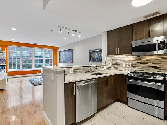 Situated alongside one of Hoboken's most beloved and beautiful parks -- Columbus Square Park -- Residence E3D at The Columbus is a vibrant 995 sq ft 1 bedroom, 1 bathroom with deeded garage parking for 1 car, elevator and gym that is remarkable for its open living, dining and entertaining space, oversize windows, sun-kissed western exposure, unsurpassed storage and the quality and execution of its many unique enhancements. Located beyond a verdant common courtyard entry on the brink of uptown Hoboken, Residence E3D is one block to the NJ Transit express bus that services New York City's Port Authority, two blocks to the bus that services Hoboken Terminal (PATH, Ferry, Light Rail, NJ Transit), and four blocks to the 9th Street Light Rail Station while an easy walk to the NY Waterway Ferry at 14th Street, Hudson River Waterfront Walkway and an array of boutique shopping and dining that make Hoboken so special. This singular home is centered around a carefully considered, fully open chef's kitchen with Corian quartz countertop, rich espresso millwork, glass backsplash, island seating, and a range of stainless steel GE Profile and GE appliances. An expansive living and dining area seamlessly emerges out of the kitchen for effortless entertaining -- it comfortably accommodates a 6-8 seat dining table and is framed by oversize windows that artfully draw-in the day's light. The master suite exists to provide much needed privacy and peace while it pampers with a crisp, spa-inspired bathroom that features Porcelanosa tile, vanity and fixtures and a walk-in glass shower with custom bench, rain shower and hand-sprayer control. Additionally, the master suite offers a walk-in-closet that is 10.5-feet deep (enhanced by custom elfa system accessories) and enough space for a separate sitting area, office and/or nursery. Life at home in Residence E3D is further enhanced by hardwood flooring throughout, custom Hunter-Douglas window treatments, central air conditioning and heat, new louver closet doors, recently replaced water heater, an easily programmable thermostat, and an in-residence LG washer/dryer. The Columbus is a well-regarded community with eighty-seven residences completed in 2001 that is special for its ideal location in Hoboken: it borders the much-beloved green space, play grounds, fountains, dog run and basketball/tennis courts of Columbus Square Park, and is an easy walk to ShopRite and Trader Joe's as well as the best shopping, restaurants, coffee shops and entertainment in town.
