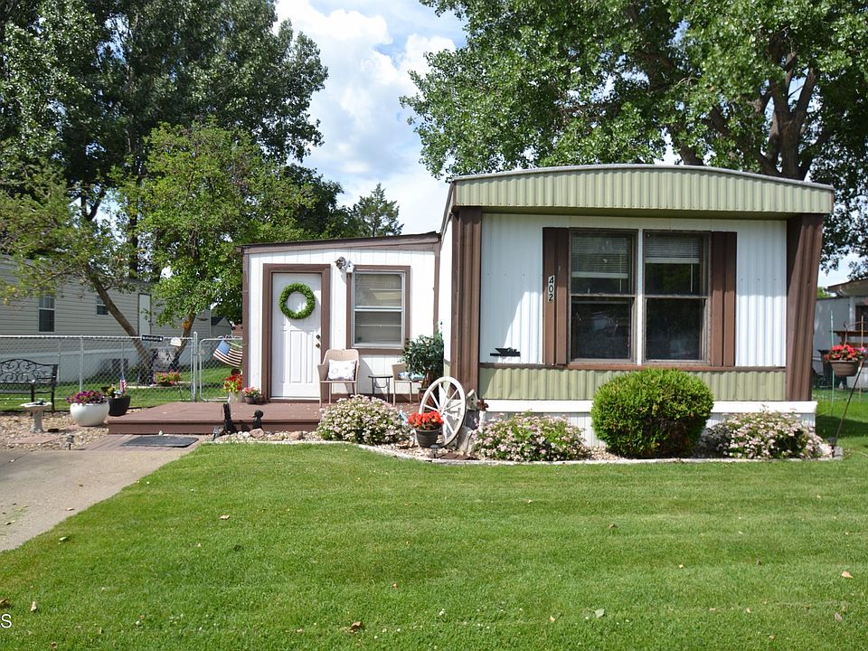 Well maintained and updated affordable home located in the beautiful Tatley Meadows Park with its mature trees and nature park appearance. You will quickly see the inviting feel of the home's front yard with its deck seating area and the well-groomed lovely, fenced yard. There is a large shed and no backyard neighbors. The home has two bedrooms and one large bathroom that includes a garden tub as well as a walk-in shower. The primary bedroom has direct access to the bathroom. The kitchen and dining area is quite spacious with an abundance of cabinet storage space. There is a patio door in the living room that leads to the deck and yard. You will have a large double-wide parking pad for off street parking as well. Furnace new last year as well as heat-tape. Several windows are newer. Roof resealed last year and new shingles on Shed two years ago. Plumbing updated about 2018. Call a realtor for a showing now as this property is priced to sell! Park approval is required, call 701-404-9442 (Tatley Meadows/Haven Park) once you've decided this is the one!