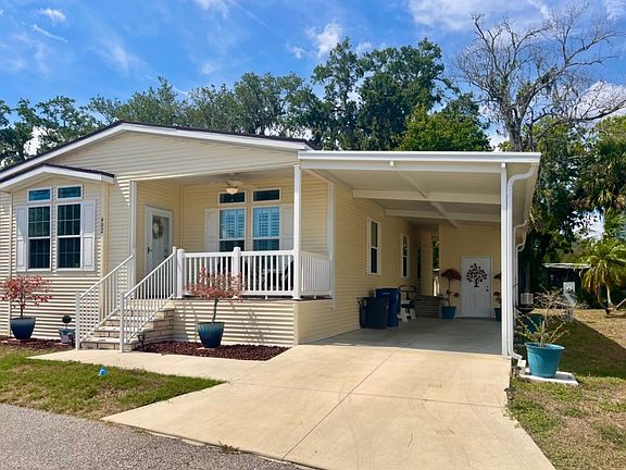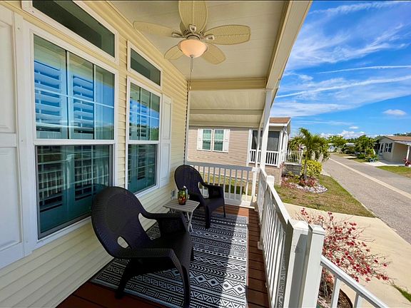 Spectacular 3 bd, 2 full bth, 1500 square-foot Palm Harbor home in the highly desired 55+resort style community of Colony Cove in Ellenton, FL. This lovely open concept layout includes gorgeous kitchen cabinetry with tons of storage including a generous pantry, huge kitchen island with built in storage, barstool seating, and generous dining area that flows into the spacious living room, making this home perfect for entertaining or just enjoying a movie or your favorite sports team while preparing your dinner. The high ceilings, plantation shutters, and upscale finishes speak for themselves. Down the hall you'll find the first of three bedrooms that's a perfect flex space to be used for guest overflow, office space, craft room....whatever your needs. Just across the hall is the guest bath with tub/shower combo. Toward the back of the home is the second bedroom, and generous master, with walk in closet, and en suite with double sink vanity, large step in shower, and tons of storage. There's a laundry room with stackable washer and dryer and another exit out to the back of the home to enjoy the back patio area where you can sip your morning coffee or an adult beverage enjoying the evening breeze. This home has an extra large backyard with no other mobile homes directly behind you, mature shade trees, and beautiful landscaping all around. This Palm Harbor home comes furnished & ready for you to drop your bags & enjoy this beautiful home and community. Colony Cove is a pet friendly 55+ resort style community offering 6 pools, 4 halls, pool hall, wood shop, 2 state of the art fitness centers, Colony Cove farm, Manatee River Pavilion and fishing pier, Picnic Island with dog runs, picnic tables, and kayak launch, Boat Marina, multiple Pickle-ball and Shuffleboard courts, nature trail, over 70 clubs to join, the Colony Cove "fun bus", and more! Just 14 miles to beaches & shopping/dining of Anna Maria Island, 17 miles to the #1 rated award-winning Crystal Sand beaches of Sarasota's Siesta key to the south, Tampa/Saint Pete to the north, and with the many local shopping, dining, cultural, and sports events nearby to enjoy, this home couldn't be more perfectly located! Lot rent for this home is $1001.23 per month & includes water, sewer, trash, recycling, lawn care, and all amenities mentioned above. Don't let this one get away! Call and start your Florida dream today! All listing information is deemed reliable but not guaranteed and should be independently verified through personal inspection by appropriate professionals. Integrity Mobile Home Sales cannot guarantee or warrant the accuracy of this information, measurements, or condition of any property. Measurements are approximate. Lot rent is subject to change.