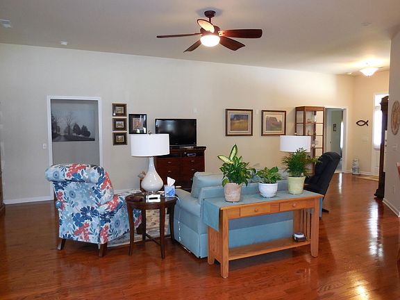 This is a lovely open floor plan with glistening hardwoods, ceramic tile, and upgraded carpet. Freshly painted, new HVAC unit, fenced pond lot, and lush landscaping make this quite a find! The spacious master bedroom boasts a tray ceiling, master bath with dual-sink vanity, garden tub and separate shower, plus large walk-in closet. The split bedroom layout offers privacy, and great flow throughout. With over 2000 sqft, two car garage, sunroom, patio, irrigation system, and tons of upgrades...this one story home is perfect and move-in ready! Call for your appointment today. A rare find at an exceptional price.