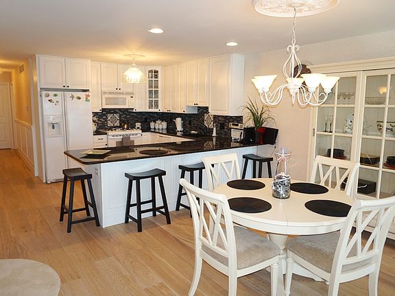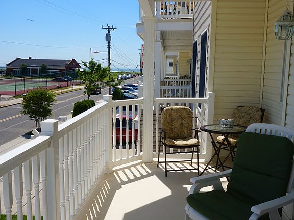 Situated on the second floor, and only one and a half blocks from the beach, this expertly customized, and recently renovated, 3 bedroom 2 bath condominium is ready for you to move in and enjoy with all the modern perks. Park with ease as you pull into your 2 car expanded garage with the ability to park one additional car outside. The intercom system will never leave you wondering who is at the front door with its audio / visual capabilities and buzzer. Once inside the unit you will be impressed by the open floor plan and exquisitely designed space, which was well configured for large gatherings. The spacious open kitchen, dining and living room design promotes an easy space for everyone to enjoy time together. The covered deck, off the sunny living room, has views of the ocean that will impress while you entertain your guests or enjoy quiet time taking in the sounds of the shore. Living steps from local tennis courts, the public library and beautiful beaches allows for limitless recreation possibilities just outside your front door. Details abound inside this home including: customized window treatments, wainscoting, granite kitchen counters, glass and slate backsplash with mosaic inserts, hand painted texture rich walls, tasteful lighting fixtures and dining room ceiling mold are just a few of the details you'll enjoy. The three ample sized bedrooms with brand new Berber carpet, ceiling fans, warm wall colors and custom window treatments will make you feel at home the moment you enter the room. Porcelain tile and granite countertops make the master bath feel luxurious. If the deep closets don't provide you with all of the space you need, there is a storage room off the garage which contains the new HVAC and new water heater. While this home has never been rented, the opportunity exists for using the property as a weekly rental investment. Welcome home! Please see associated docs for furniture inclusion list, master deed and condo docs.