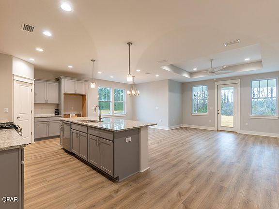 INTERIOR features of this coastal inspired home offer a private Foyer entrance, large volume great room with an open floor plan, kitchen with center island, custom cabinetry with soft close drawers & stainless steel appliances, master suite with tray ceiling, tile shower, double vanity & large walk-in closet. Guest bedrooms with access to full bath, dining room, & laundry room. EXTERIOR of this home features a 2-car garage, covered porches in the front & back, fully sodded yard with sprinkler system.
