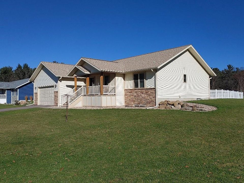Don't want the hassle to build... but want the New home without the wait? 3B/2B 1600+ sq ft home with full unfinished basement, fenced in rear yard, 2 car attached garage, covered porch, composite decking complete with a porch swing. En suite bathroom to main floor bedroom with jetted tub, separate shower and double sinks. Large walk in closet. Laundry Room doubles as mud room off garage. 8ft+ ceilings in the basement and stubbed for a third bathroom. Egress windows ready for your build. Access to Park, Pavilion, and BB court- across street- Greenspace!. Skylight, vaulted ceilings, newly landscaped 2022 and fencing, rear deck. Possibility to be a smart home. Enjoy the location near Wisconsin Dells but away from the hustle and bustle. NO HOA! Buyer to verify sq ftg and info if impt