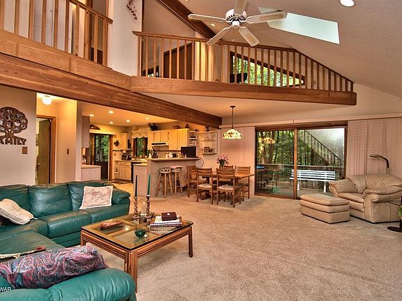 Beautiful contemporary home located on a secluded, wooded lot. It's starts with the awesome curb appeal, then the open concept floor plan will really ''wow'' you. The cathedral ceiling in the living room allows you to see the open loft and beautiful wood accents of the second level. The large open kitchen has plenty of cabinet space and is open to beautiful screened in porch and the living area. Living area has a tile faced propane fireplace, access to the rear deck with hot tub. Master Bedroom with full bathroom and loft overlooking the living room and private balcony. Laundry on the main level for your convenience. A finished high crawl space for extra storage. Wall unit A/C's on both levels. Located in a four season amenity filled community with lakes, beaches,