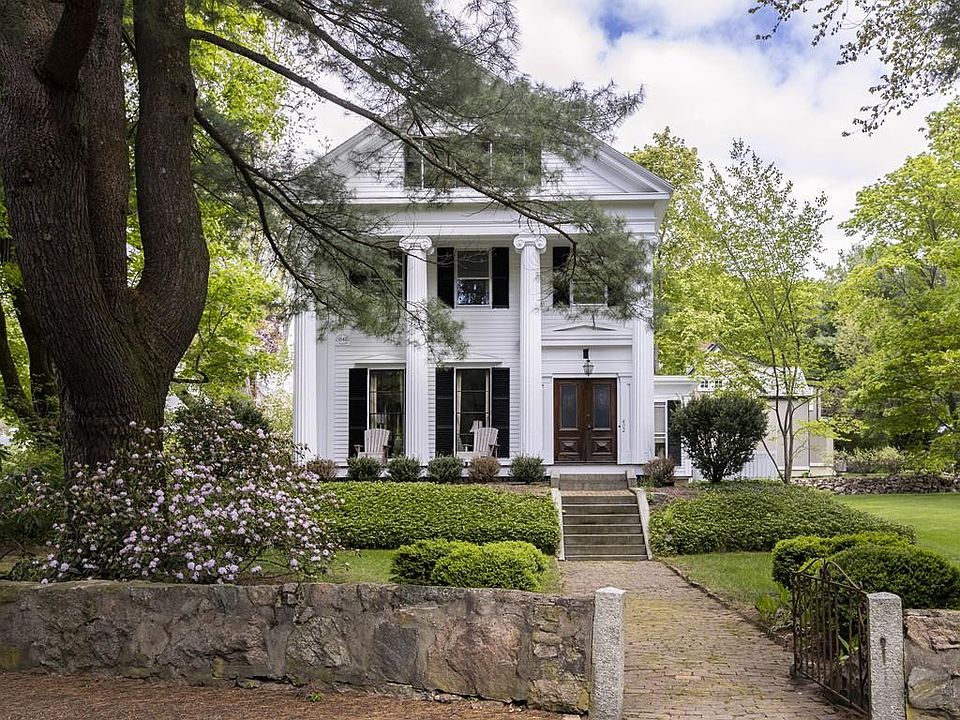 Yes, it's 'that' house! Offered for the first time in over 45 years, this much admired 4 bedroom, 2.5 bath Greek Revival built in 1848 sits on a picture-perfect corner lot close to town, train and schools. Instantly appealing with a hitching post and inviting front porch, this charming home is flooded with natural light from floor-to-ceiling windows and filled with rich and historic architectural detail. A central fireplace anchors the oversized living & dining room - perfect for gracious entertaining. The updated eat-in-kitchen with cherry cabinets and granite countertops opens to a cozy family room with access to a deck overlooking a large, level yard. A private study, large mud room, central air and underground sprinklers completes this package. This important Wellesley residence is the best of both worlds--urban convenience with a neighborhood setting.